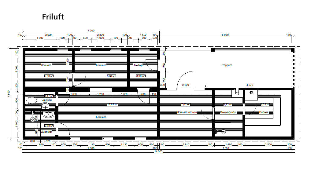 - Комната отдыха — ~6,5–7,0 м²