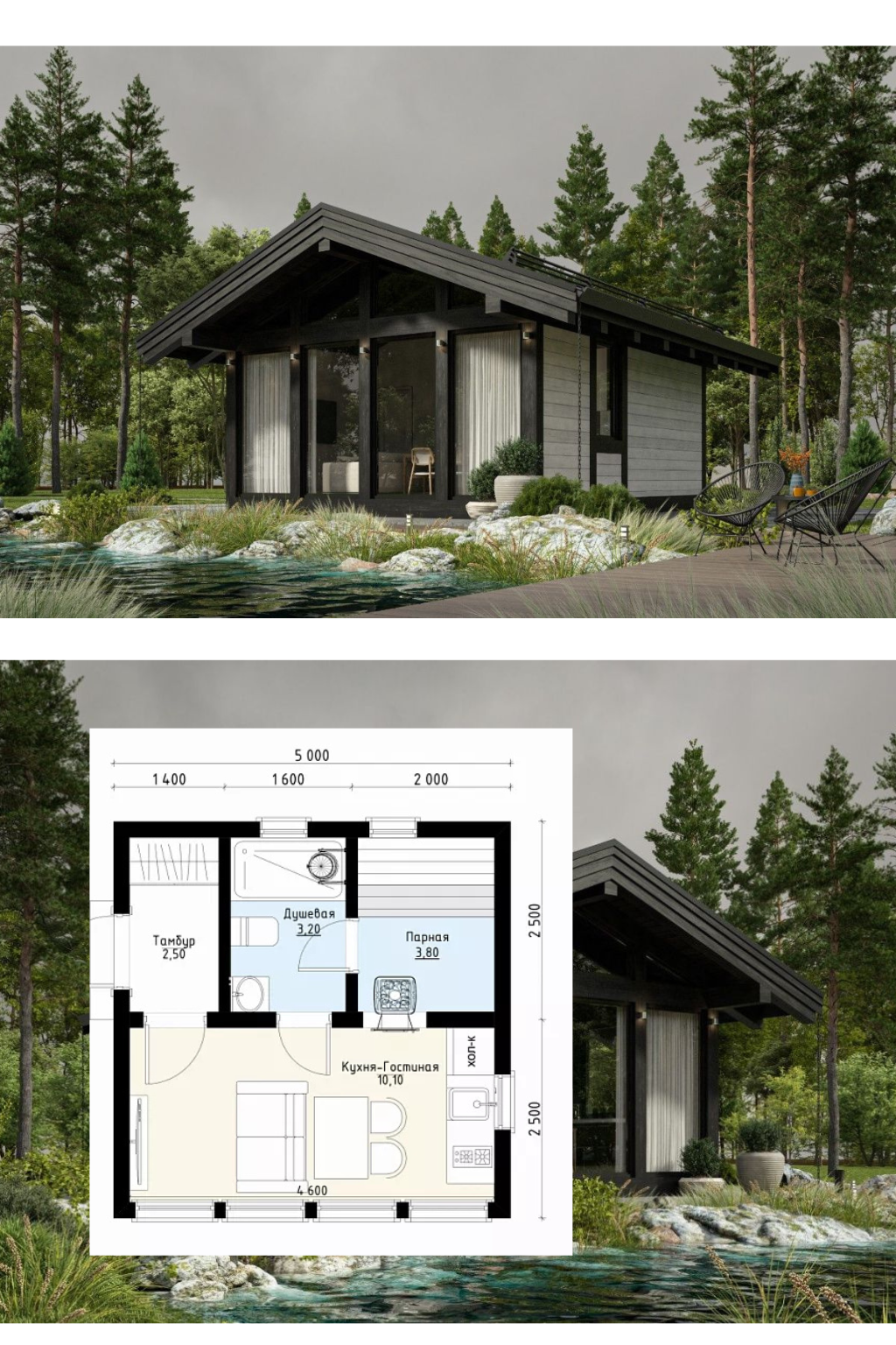спроектированная для комфортного отдыха в любое время года. Лаконичная форма, двускатная кровля и панорамное остекление формируют выразительный, но сдержанный образ, который органично вписывается в природное окружение.
