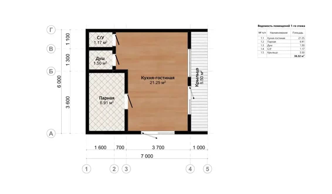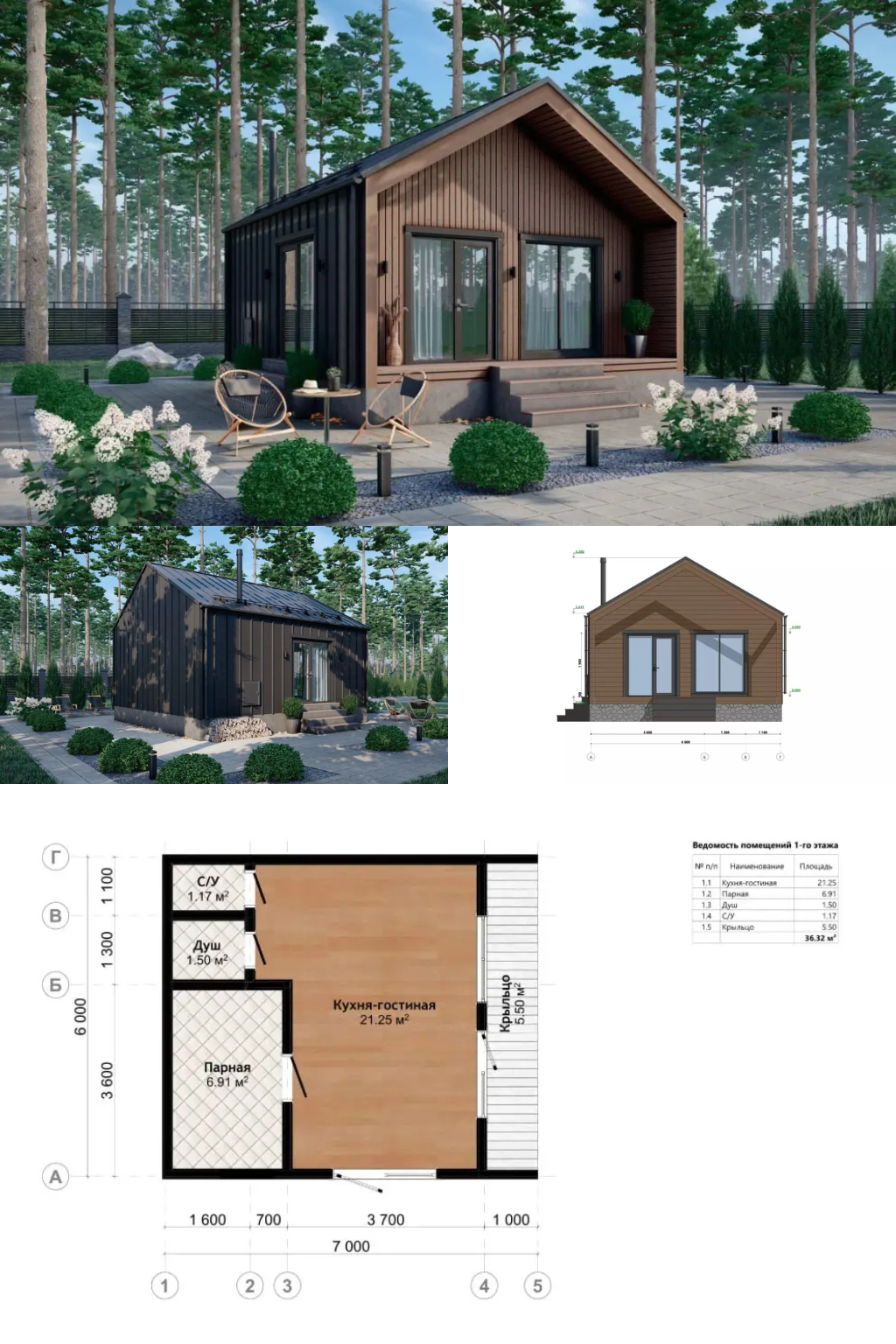- Габариты по пятну застройки: ~7,0 × 6,0 м