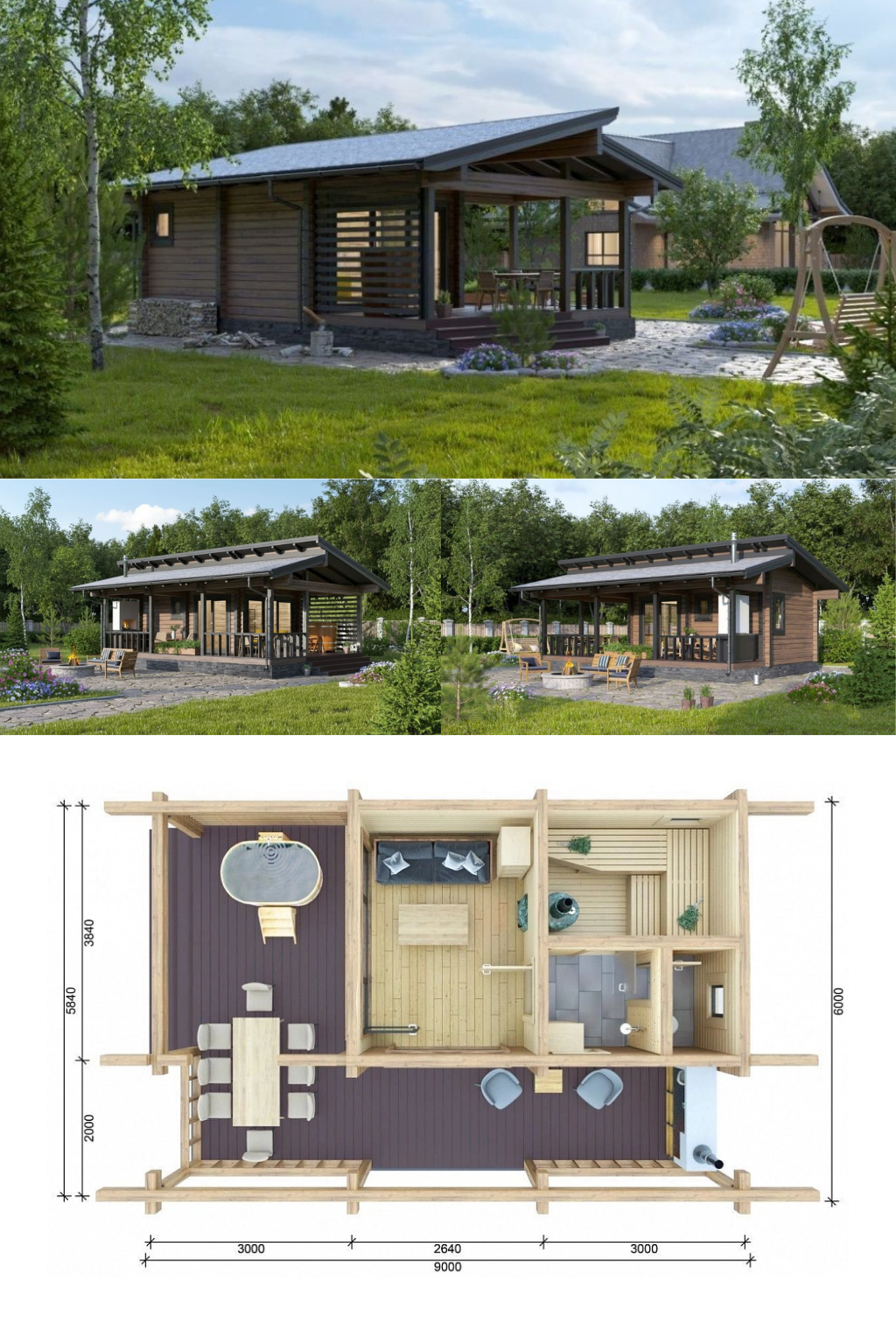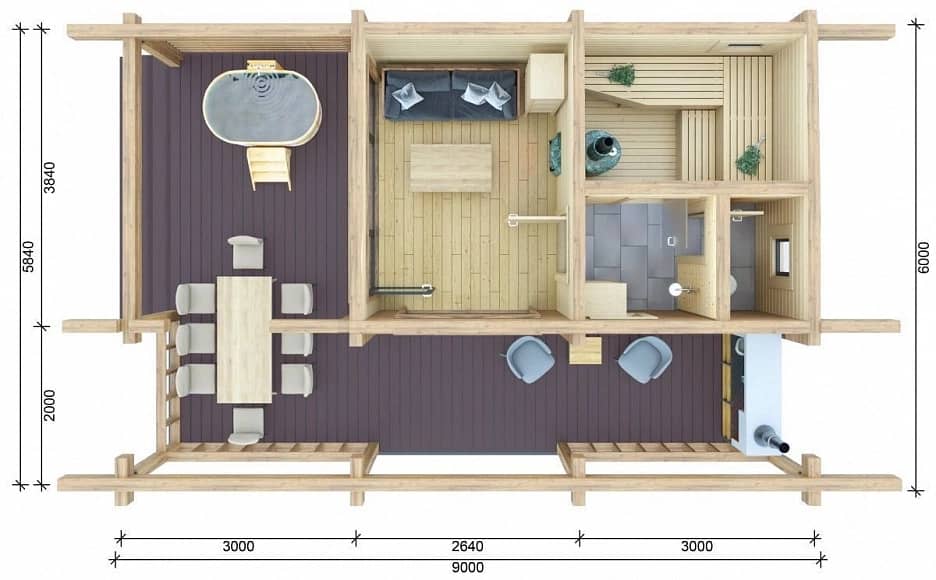 • Габариты по пятну застройки: ~9,0 × 6,0 м (с учётом террасы)