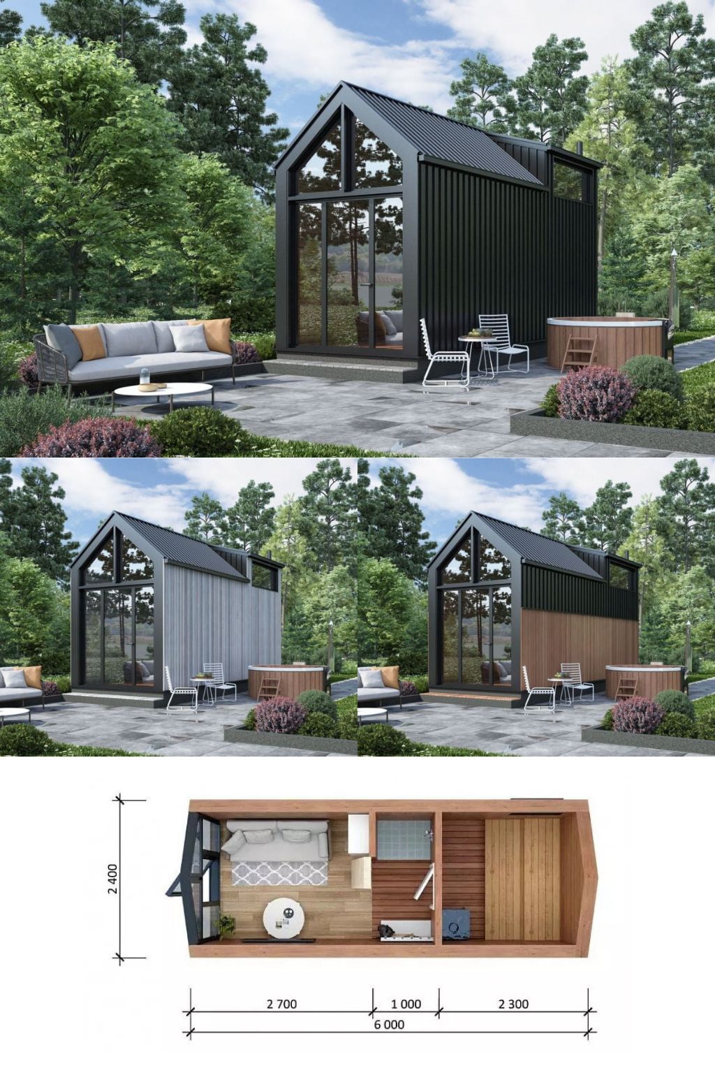 Внешний облик бани выполнен в стиле barn house с двускатной кровлей и высоким фронтоном. Контрастное сочетание тёмных вертикальных фасадных панелей и тёплого дерева создаёт современный и выразительный образ. Панорамное остекление на фасаде усиливает ощущение пространства и делает баню визуально «лёгкой», несмотря на компактные габариты.