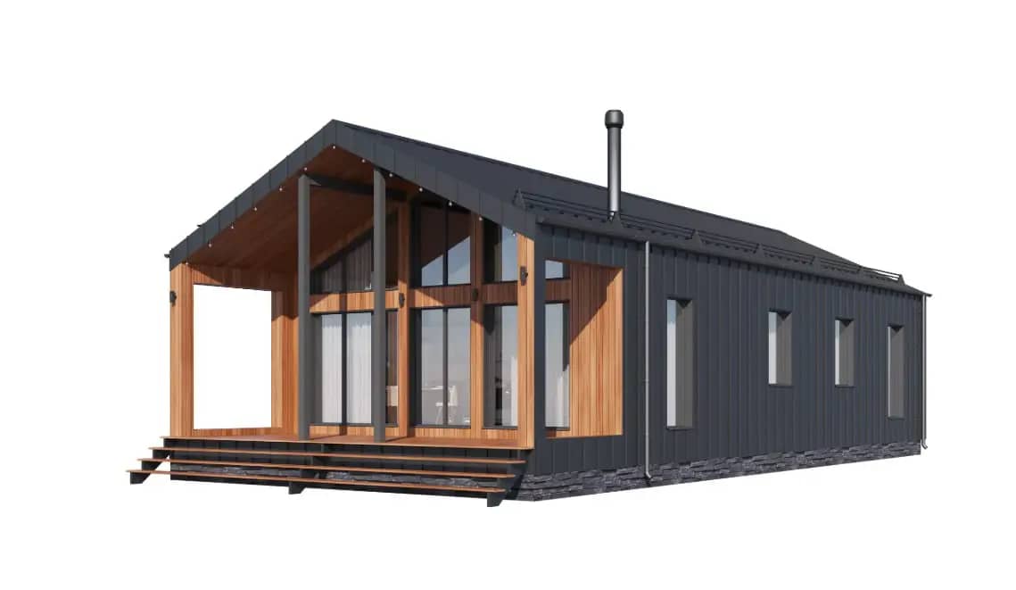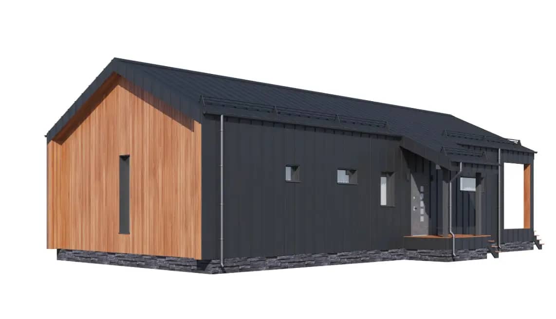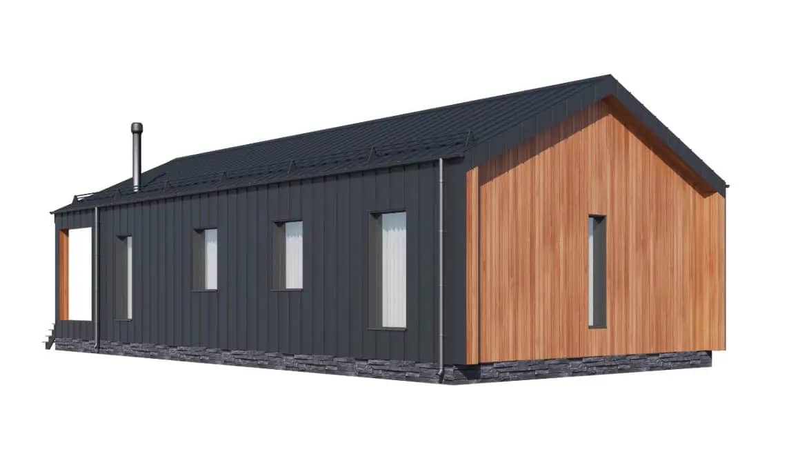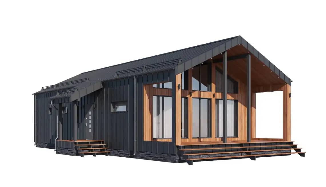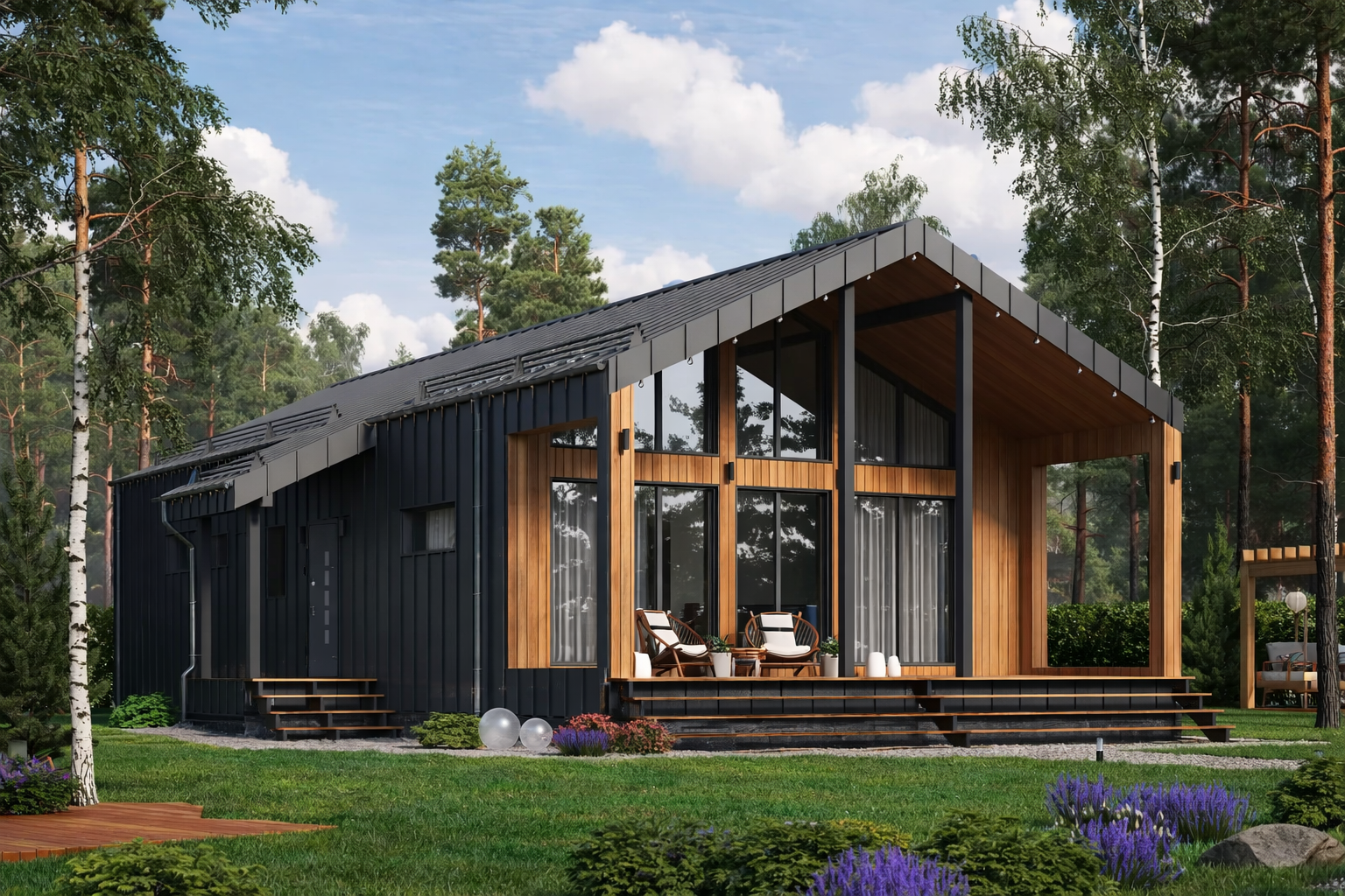 Проект выполнен в современной скандинавской стилистике с выразительной двускатной кровлей и панорамным остеклением по главному фасаду. Такая форма обеспечивает: