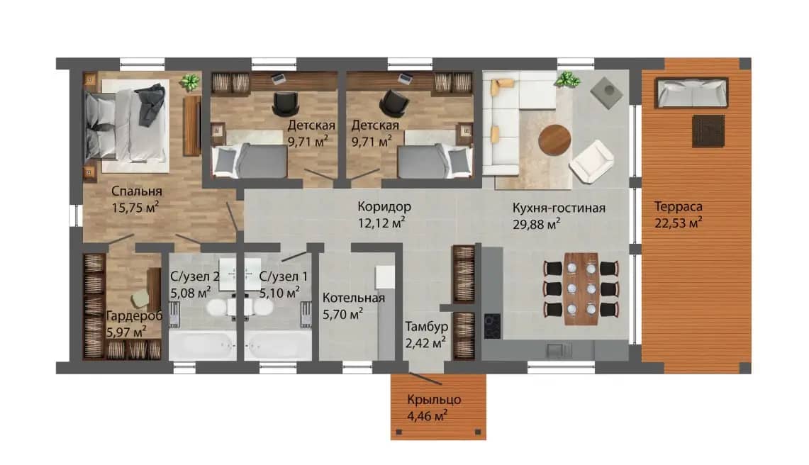 - кухня-гостиная 29,88 м² с выходом на террасу 22,53 м²;