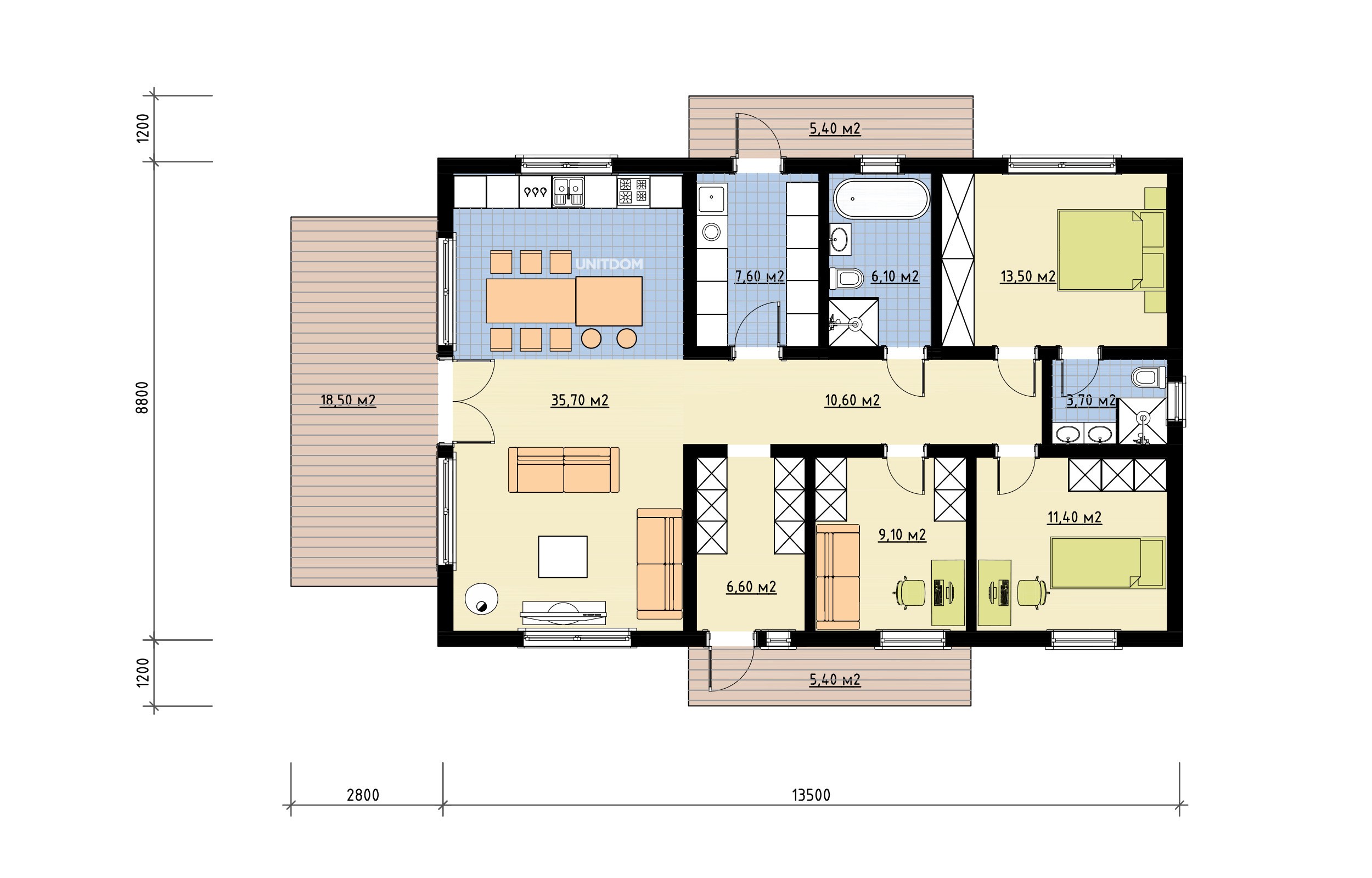 - Кухня-гостиная — 35,7 м² с выходом на террасу 8,1 м²