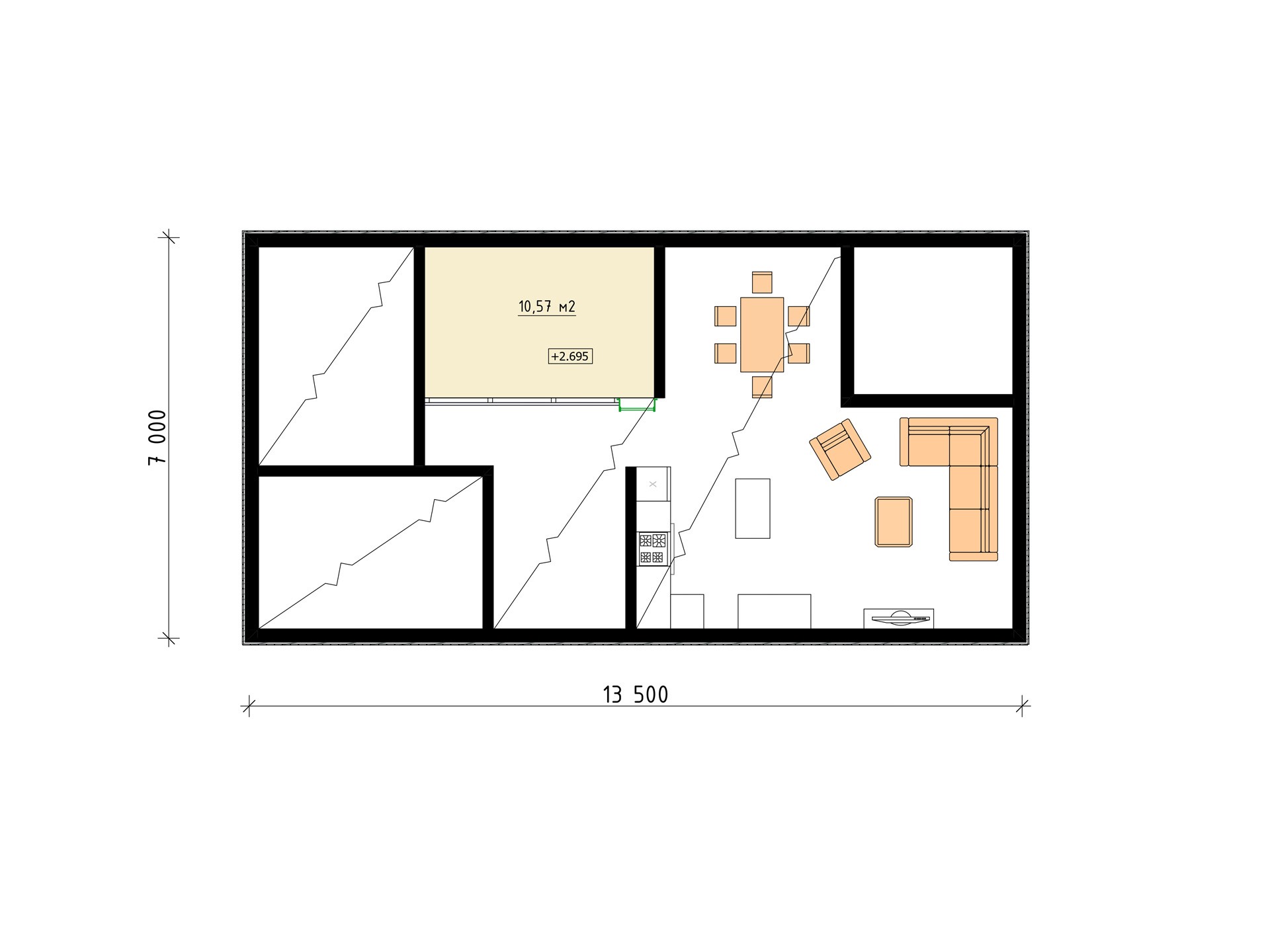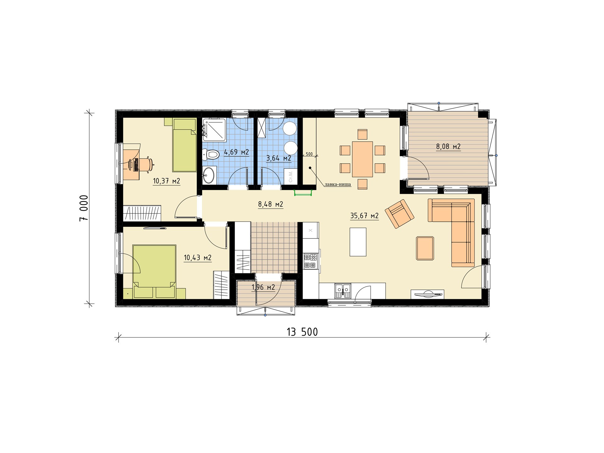- кухня-гостиная 35,7 м² с выходом на террасу 8,1 м²;