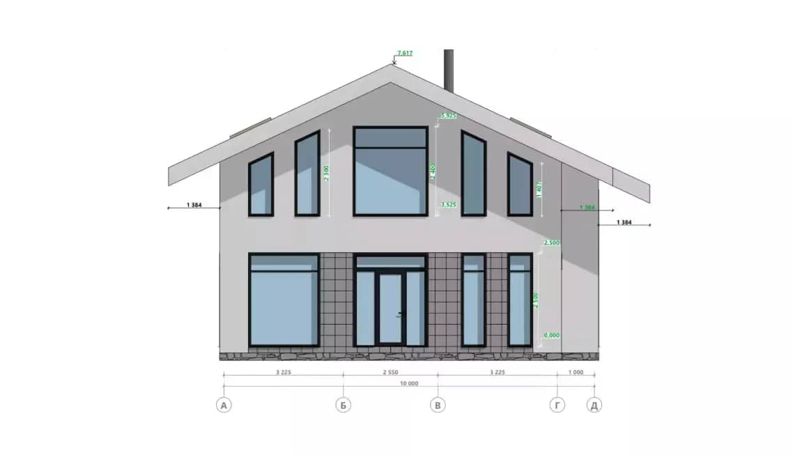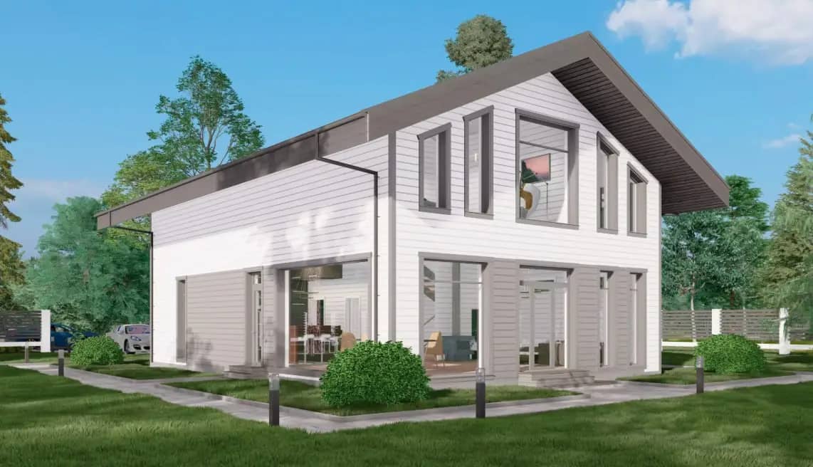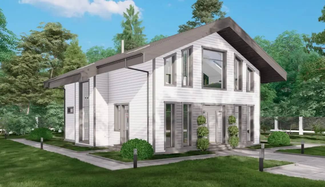 В основе концепции — простая и логичная геометрия, где архитектура подчинена не декоративности, а функциональности и долговечности. Двускатная кровля формирует узнаваемый силуэт дома, обеспечивает эффективный сход снега и надёжную работу кровельной системы в условиях сурового климата.