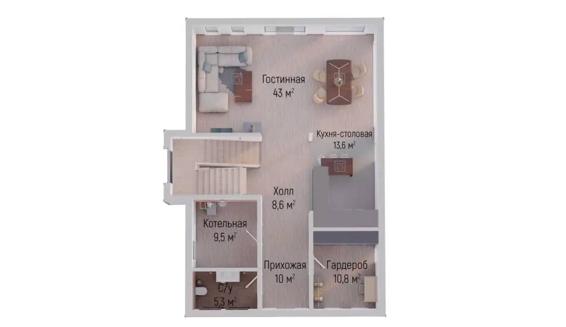 - гостиная 43 м² — центральное пространство дома;
